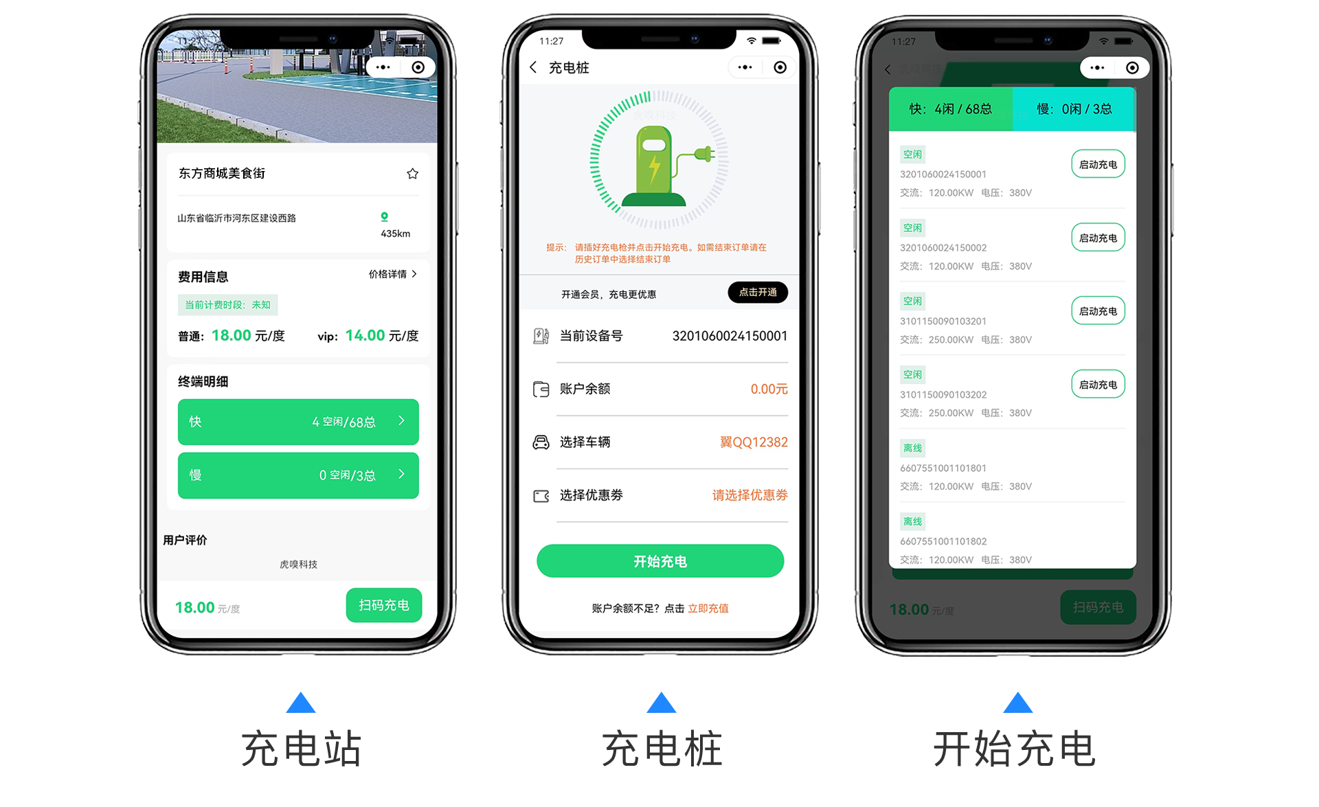 2、启动充电:与扫码充电不同的是,需要添加车辆信息,在小程序端口选择设备,启动充电,两种方式都很好操作上手。